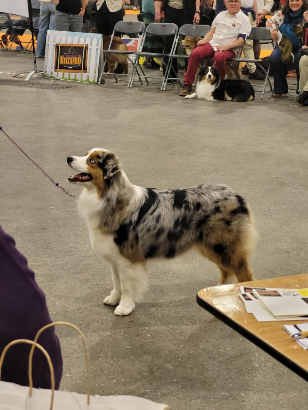2 ans, sujet masculin de taille moyenne, excellent type, tête équilibrée, DCC, l'oreille à peine lourde, l'oeil de bonne forme, excellente encolure, épaule, corps et aplombs, belle fourrure, mouvement typique et efficace.
